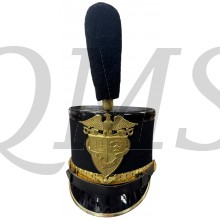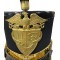 This shako is in very good condition and has its original pompom. The stamped brass front insignia shows the St Johns Northwestern crest / coat of arms and the university motto “Laborare, Ludere, Orare”.The front of the brass decorative chinstrap includes a stylized eagle. Side buttons with infantry crossed rifle. 2 brass colored vents on side of the hat. The visor is made of black lacquered plastic with green lining. The chinstrap is hook to the back of the hat and shows a 100% of its original lacquered finish. There are a few nicks on the plastic visor and hat top due to its age.