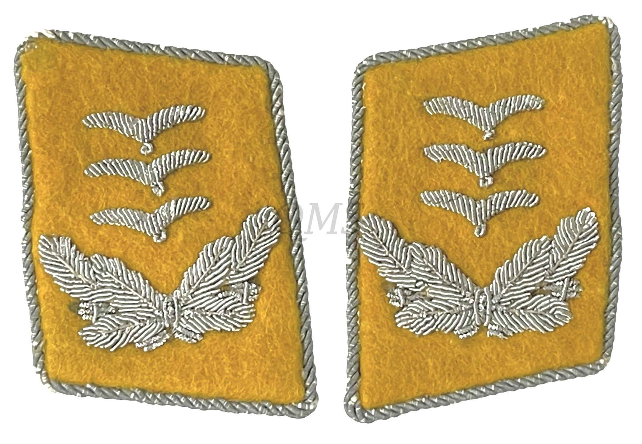 The yellow backing of the collar tab denotes the wearer as an elite Fallschrimjager (paratrooper) of the Flieger Division. The three silver gulls and singular oakleaves on each tab represent the rank of Hauptmann.