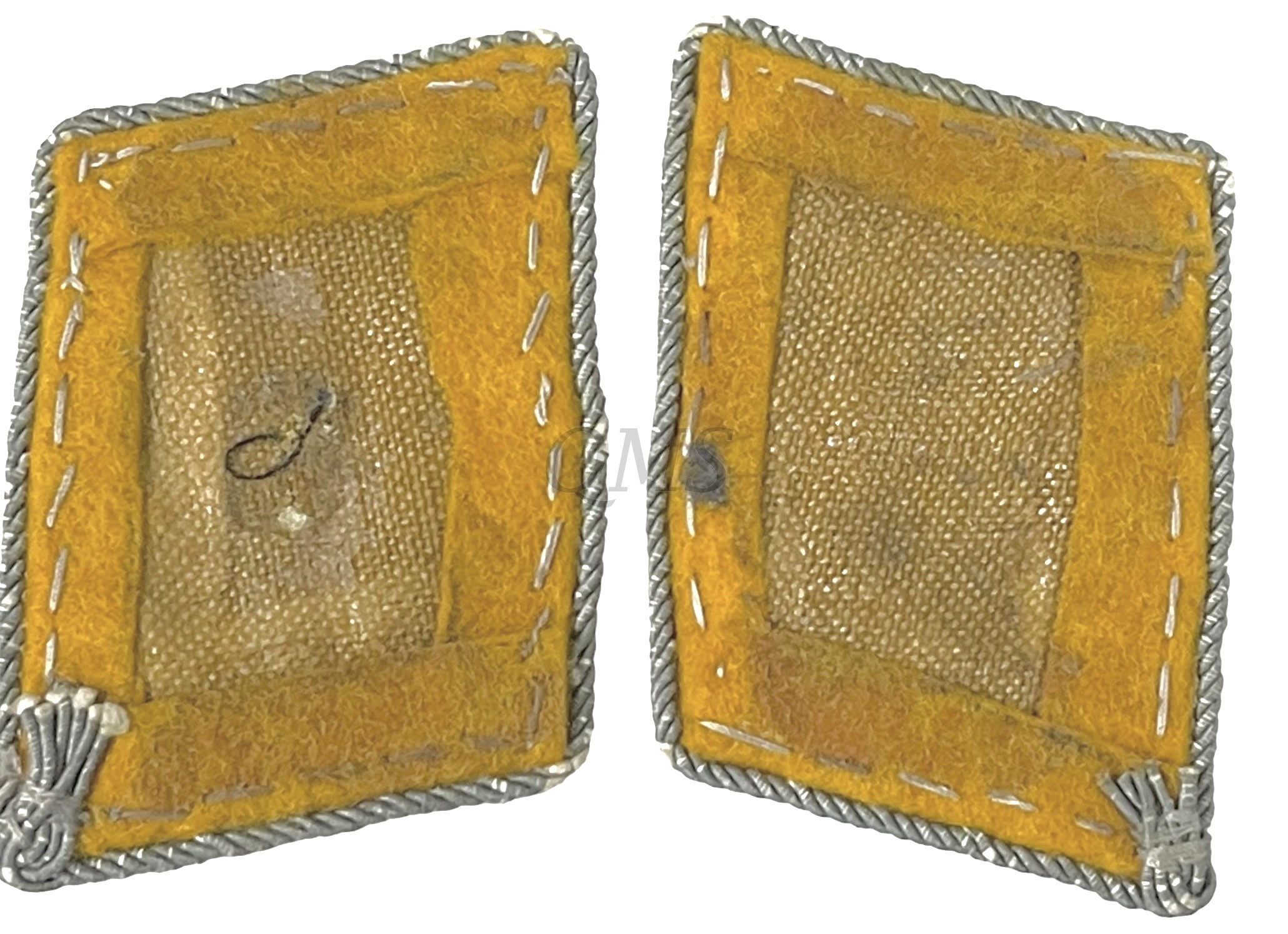 Embroidered silver bullion on yellow with a silver piping.