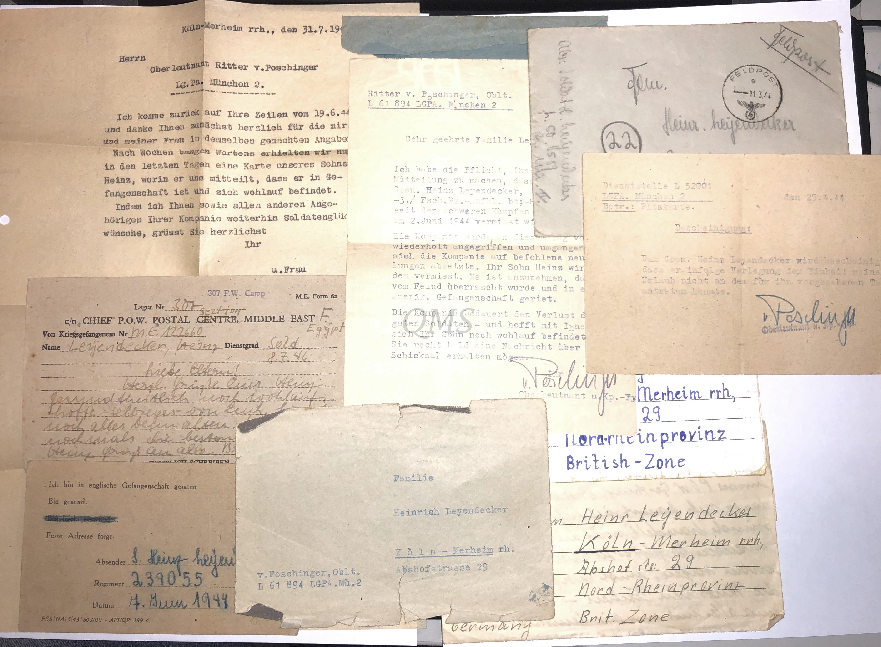 brief 1944 Oblt Ritter von Poschinger vermissing H.L., brief 1944 moeder aan Oblt van Poschinger kaart Rode kruis met melding in gevangenschap, kaart van H.L. 307 F.W. Camp Middle East 1946, 2x POW letter Egypt H.L. 1946 aan familie , Bescheinigung 25-4-44 ivm Urlaub nicht an zu treten , Prisoner of War post card, (ich bin in englische Gefangenschaft geraten juni 1944, brief met omslag Italien 1944