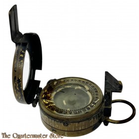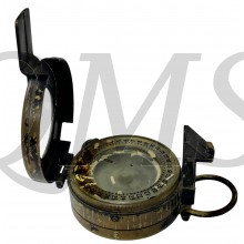 The compass has a brass case. The lid has a viewing window with sighting line and luminous markers to the inner lid. There is a free moving 1¾" dry card dial with a mother of pearl chapter ring. The inner scale is marked every five degrees whilst the outer scale is marked every one degree marked with the reciprocal bearing in reverse for viewing through the prism. There is a black painted centre with a luminous arrow marking north and the compass is covered with a flat crystal with a luminous bearing mark. The outside of the case has a momentary bearing lock and transit lock