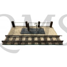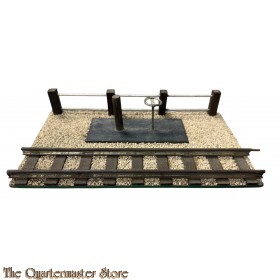 In het midden bevindt zich een houten paal en een metalen ring, wat lijkt op een onderdeel van een spoorweginfrastructuur zoals een signaal- of overgangsmechanisme.