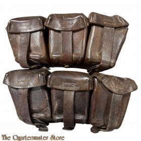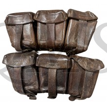 BACKGROUND: The M1909 ammo pouch was issued in two design variants: a smaller pattern, intended for use by mountain troops and cavalry, which held thirty rounds of 7.92mm ammunition, and a larger version, for infantry, which held forty-five rounds. Front line personnel would each have been issued two of these. Engineers, motorized troops and foot artillery used the one-piece 87/88 pouch, and reserve, Landwehr and Landsturm units used the 88 and 95 pouches, which the M1909 replaced. All of these pouches were in tanned leather, until 1915, after which they were blackened.