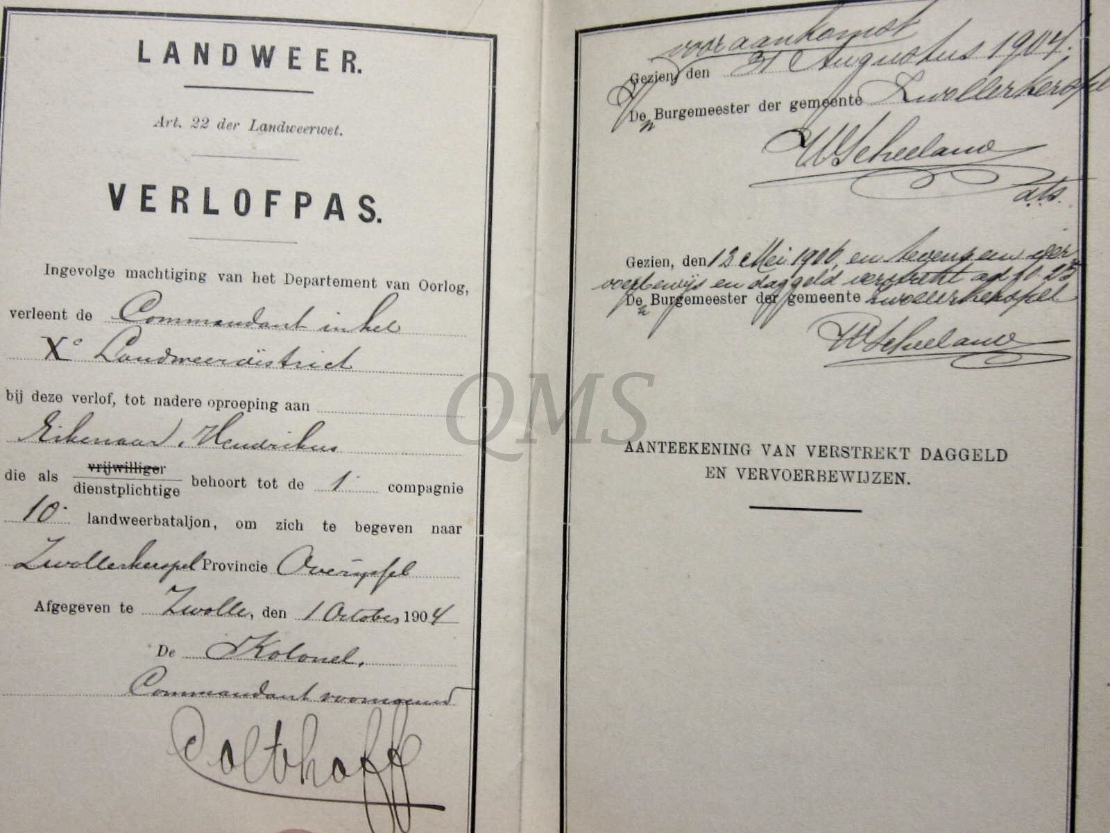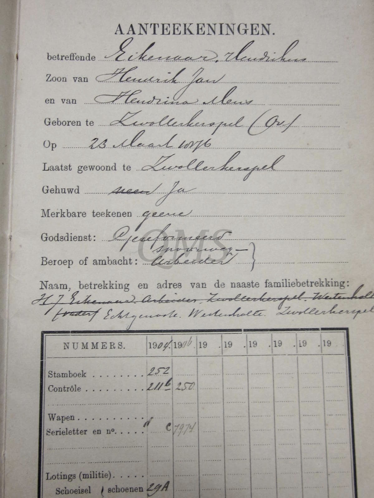 H. Eikenaar, 1896 als loteling bij 5e Regiment Inf , 1904 ingelijfd bij de Landweer