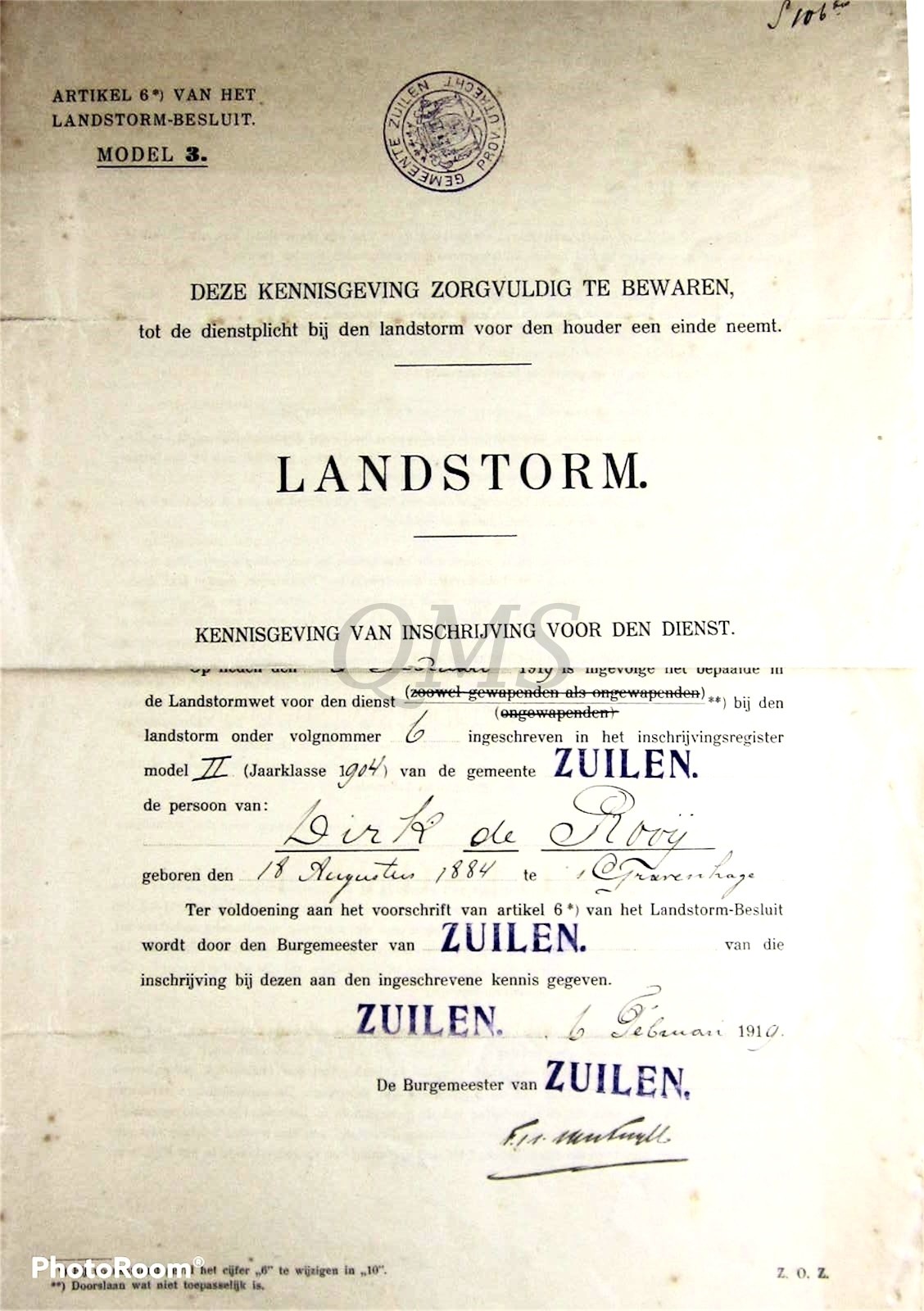 eerste geval (inschrijving) Nationale Militie 1903, bewijs van inschrijving voor den dienst Landstorm 1919