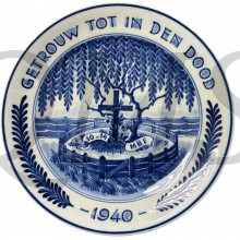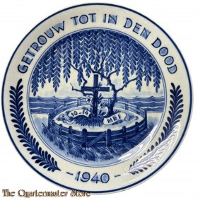 Delfts blauw herdenkingsbord meidagen 1940. Getrouw tot in den dood 1940. Het bord verkeerd in een zeer goede staat en is nog voorzien van een ophang touwtje.