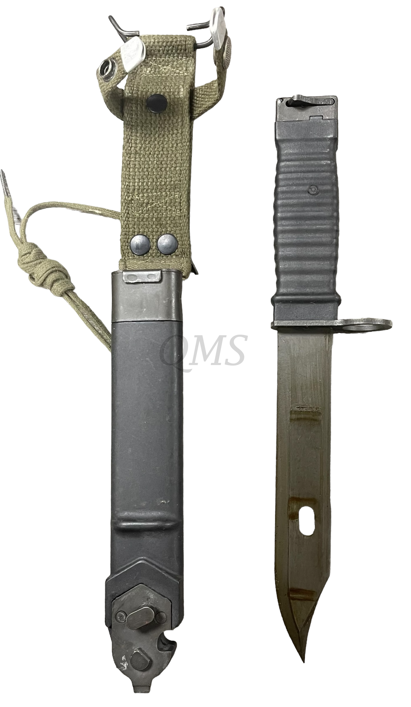 It features the saw back blade, wire cutter scabbard, and is complete with the original leather leg tie still coiled from the factory. The blade is marked with the Eickhorn squirrel trademark over “NWM” (Nederlandsche Wapen-en Munitiefabriek). A wonderful bayonet for the Vietnam war collector