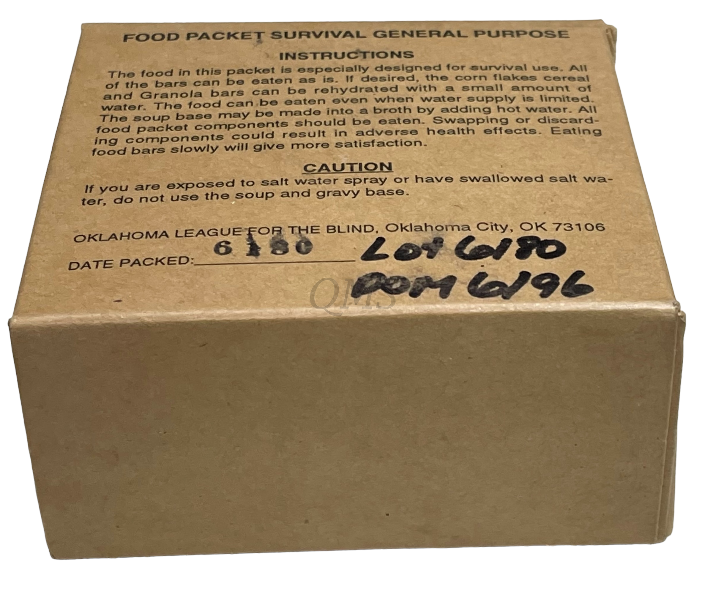 The Food Packet, Survival, General Purpose, Improved is used by the Services to sustain an individual in survival situations, including escape and evasion, under all environmental conditions, and when potable water is limited.