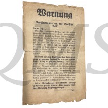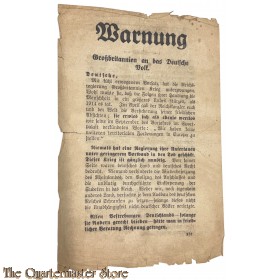 The British propaganda leaflet dropped on the Germans, 4 3/4" x 8" and printed on both sides by His Majesty's Stationary Office. Its first dissemination was by aircraft on 03/04 September 1939. It reads, in part: "WARNING A Message from Great Britain German men and women, The Government of the Reich have with cold deliberation forced war upon Great Britain. They have done so knowing that it must involve mankind in a calamity worse than that of 1914. The assurance of peaceful intentions the Führer gave to you and to the world in April have proved as worthless as his words at the Sportpalast last September when he said:- ''We have no more territorial claims to make in Europe''... 14 x 21,5 cm