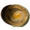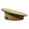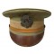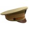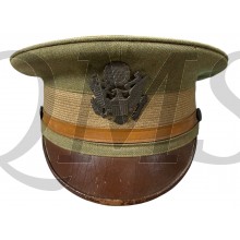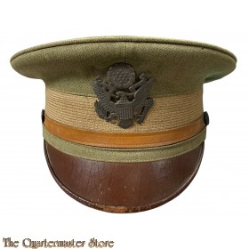Khaki wool top with ribbed cloth centerband and a brown leather visor. The cap badge depicts the coat of arms of the United States and it is the badge that is worn by all ranks on the visor cap. A brown leather chin strap in held in place by a pair of small brass buttons that have the same design as the cap badge to them. A pair of painted metal grommets are to the underside of the crown