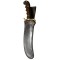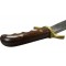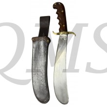 This bolo knife was manufactured at the Springfield Armory in Springfield, Massachusetts. It is labeled US 5202 near the hilt, and SA 1909 on the reverse side near the hilt. Both the knife and scabbard have light wear . the handle is in good condition, as is the brass guard. The blade is in good condition