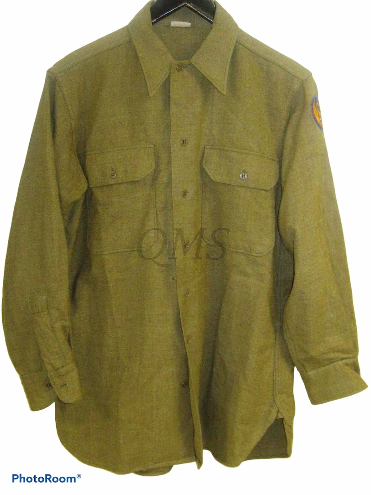 This is the standard shirt for the US Army and was vworn by all Branch of Services in World War Two. Designed to be worn as part of the A class dress uniform with the four pocket tunic or Ike jacket and the M1937 wool trousers. It was also worn with the Infantry M41, M43, Tankers and M42 para jackets as part of the combat uniform.