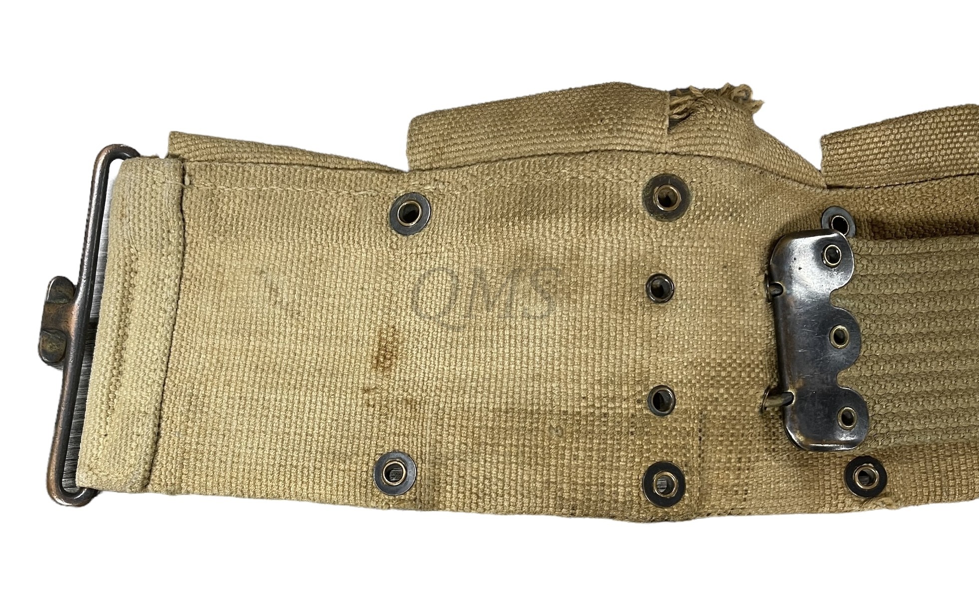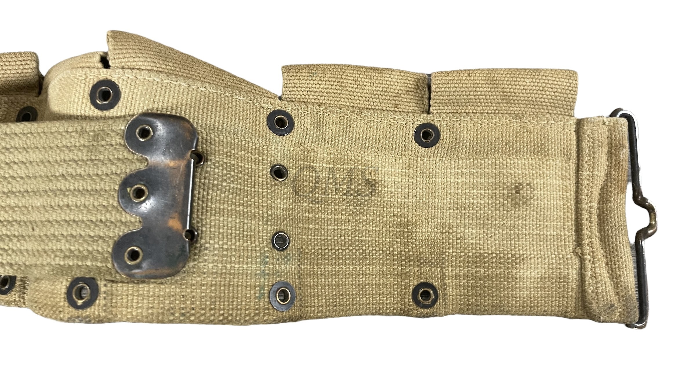 The M-1910 Infantry Belt was produced from 1911 to 1920 and had ten pockets to carry 100 cartridges on five round stripper clips for the M1903 or M1917 Rifles. There were many minor variations of pocket snap types and fabric construction.