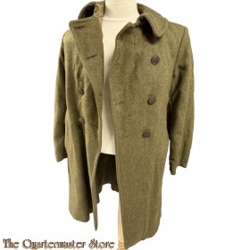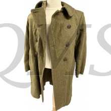 the M1917 Overcoat. This differed from the M1904 by having only a half length cotton liner and straps on the cuffs. The straps served no purpose and were to be eliminated from later overcoat patterns. This overcoat with a contract tag dated April 1917 is a later pattern that was shortened versus the original longer pattern that extended well below the knees. The coat's liner stops at the waist vs. the bottom of the coat as found on later earlier patterns.