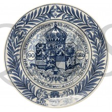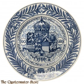 Prachtig keramiek wandbord ter herinnering aan het 25-jarig huwelijksfeest van Koningin Wilhelmina en Prins Hendrik in 1926. Het bord is gedecoreerd met een gedetailleerd wapen en omringd door een sierlijke bladrand in blauw-witte tinten. Een uniek stuk voor verzamelaars van koninklijke memorabilia of Delfts blauw.