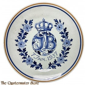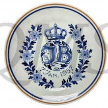 Prachtig antiek keramieken wandbord, gemerkt Delft, met een gedetailleerd ontwerp van een kroon en initialen 'J.B' omringd door bloemmotieven. Het bord draagt de datum 7 JAN. 1937, wat duidt op een speciale gelegenheid of herdenking. Een uniek verzamelobject voor liefhebbers van Delfts blauw en historische keramiek