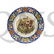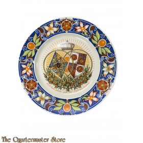 Prachtig vintage keramiek wandbord ter herdenking van het huwelijk van Prinses Juliana en Prins Bernhard in 1937. Het bord is gedecoreerd met de wapens van het paar, omringd door een kleurrijk bloemen- en fruitmotief