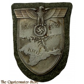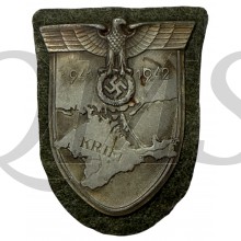 The Crimea Shield (known as "Krim" Shield to collectors) was awarded to German soldiers under the command of Generalfeldmarschall Erich von Manstein who fought and conquered Crimea (Krim in German) in between September 1941 and July 1942. The Crimea Shield was instituted on 25 July 1942 and was the most widely distributed of the shields with approximately 250,000 being handed out. From 21 September 1941 until 4 July 1942 German soldiers faced severe opposition from the Russian army while attempting to capture the important Black Sea ports around Sevastopol. This particularly difficult campaign was recognized in the form of the Shield. The shield was worn on the upper left arm of the recipients uniform. It was sewn on via the backing cloth but