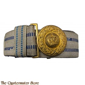 The toned gilt buckle has the finish largely intact. The silver and blue brocade fabric shows typical toning from age but both the belt exterior and the wool interior are in excellent condition. Belt / buckle are adjusted by way of a stud attached to the buckles keeper