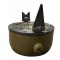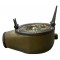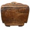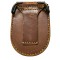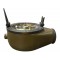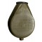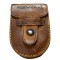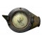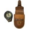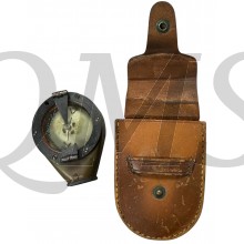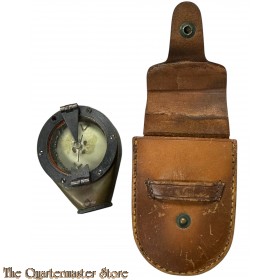 The internal brass compass directional disk turns easily. The brass components show uncleaned patina. The compass has some wear to the paint on the underside. The leather case shows spots and age but it is complete and intact.